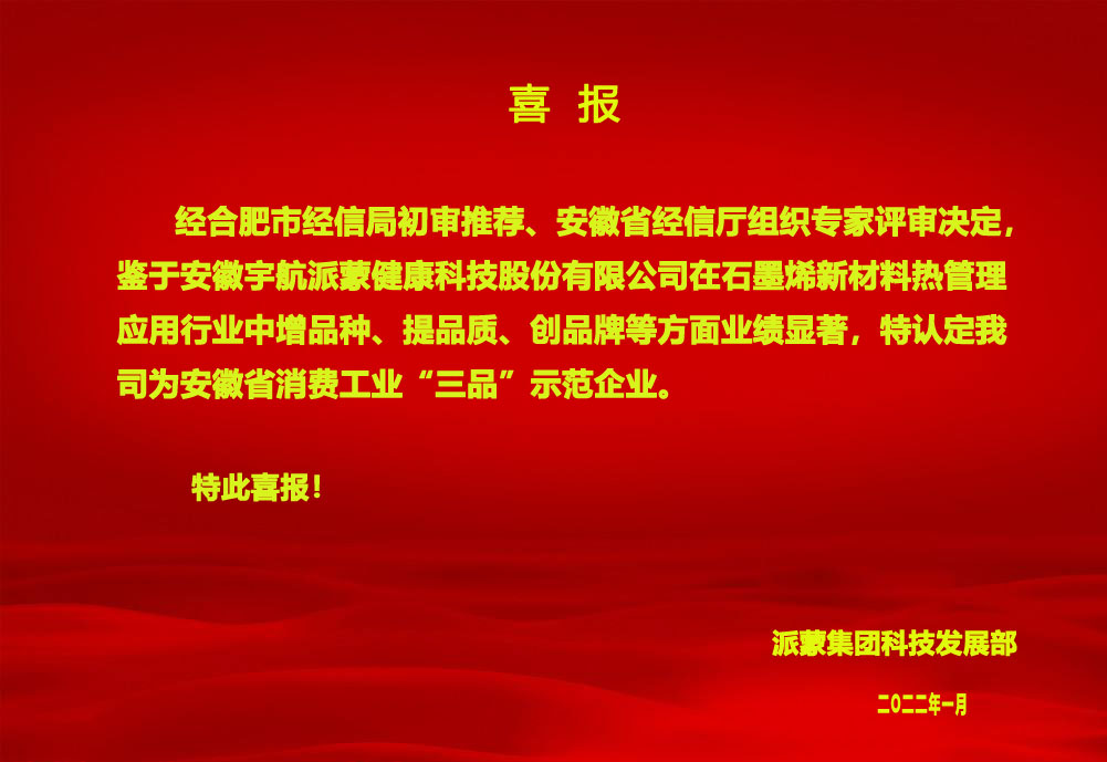 Прошлый месяц, Группа ПМА was selected by Anhui Provincial Department of Economics and Information Technology as the "Three Grades" Demonstration Enterprise of the Provincial Consumer Goods Industry. Improve quality and create brand awareness, focus on improving quality and efficiency and industrial optimization and upgrading, and accelerate the promotion of high-quality development of the provincial consumer goods industry.